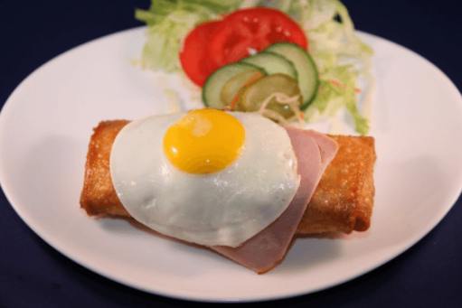 Met gebakken ei, ham, satesaus en frites Keuze uit: Appelmoes, Chilisaus, Curry, Fritessaus, Joppie, Ketchup, Knoflooksaus, Oorlog en meer.